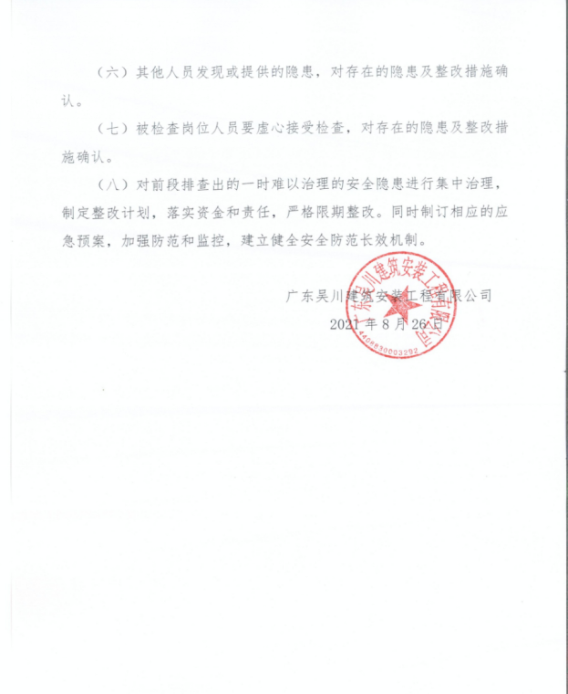 (二)重大安全隱患整改結(jié)束后,由分公司主要領(lǐng)導組織初驗、項目部主要負責人組織最終驗收、銷號。
